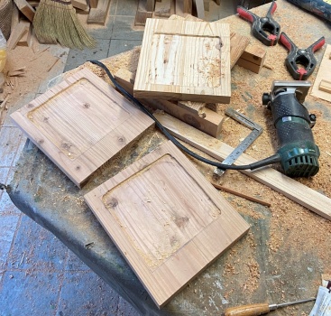 鉢置きなどのアクセントに約17.5cm四方の6mm凹みを手持ちトリマーで削り取る。
