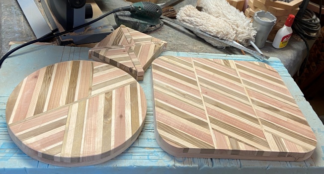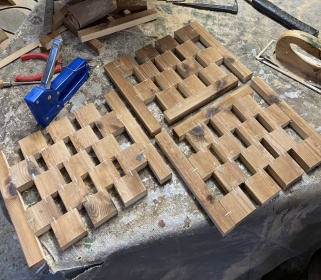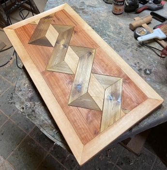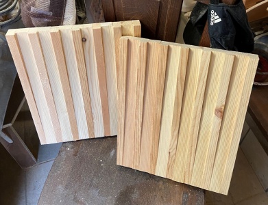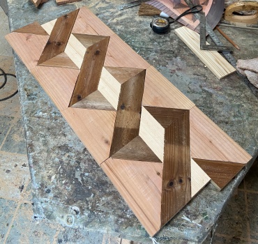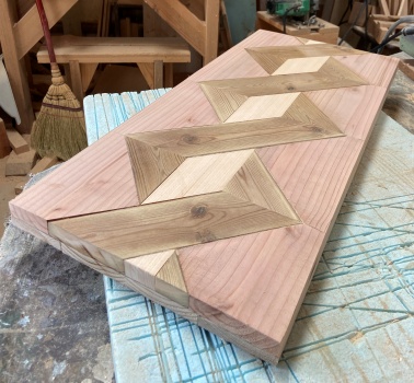 繰り返す連続した模様を斜めにずらした図案も面白そうかと、 1.8cm厚 縦横 26*56cm程度の模様板を 2 枚作ってみた。(上左)