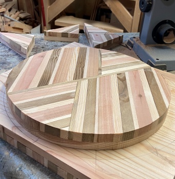 ひとつを円カットし、およそ直径337mmほどの32mm厚のデザイン丸板。スツールの天板にでも。