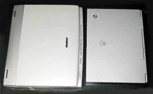 学校で、ノートが必要になるというムスメの要望から支度したモノ。 当初はモバイルにも適したB5ファイルサイズのものがいいだろうかと探していたが、 PCにそれほど詳しいわけではないので、オールインワンノートがやはり無難かと。 ノートでこのSPECなら当分不足は感じないでしょうし。何てったってギガノート。 ザコン館で\209,800の値付けで溜息が出たが、同型番がニッシンパルで\169,800の箱入り。 アキバで\40,000の差が出ていたことに驚いて、少しは得した気分。 (この日の最安値にはちょっと届かなかったが、アキバに出た甲斐があった買い物) しかし、自宅でSETUPしてみると、改めてデカイ !! ワタシが仕事で使ってるGatewaySOLO3100(右)と比べると、 同じA4でも2まわりは大きい。いわゆるA4ファイルサイズ..ってやつの大きさを実感。 持ち運びは多少どっこいしょ...でやるしかないかも。(^_^;) モバイルやりたくなったら、父ちゃんのと交換かなぁ。...(期待?!) |