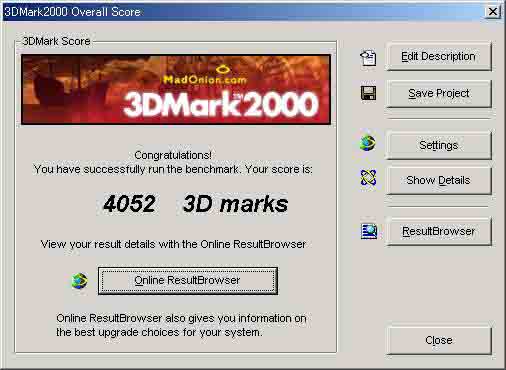 FSB UPによる効果は当然ビデオにもでている。 Win2K ではなかなかトータル4000Overは出なかった。 (ビデオはG400からAGP 4*可能な Hercules 3D Prophet II MXに 換装してある。) |