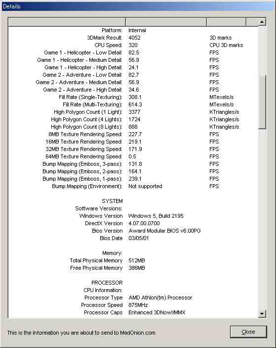 M/B Name Processor AMD Athlon 869.33MHz[AuthenticAMD family 6 model 4 step 2] Cache L1_Data:[64K] L1_Instruction:[64K] L2:[256K] Name String AMD Athlon(tm) Processor VideoCard 3D Prophet II MX Resolution 1152x864 (16Bit color) Memory 523,760 KByte OS Windows 2000 5.0 (Build: 2195) Date 2001/04/04 09:08 プライマリ IDE チャネル ST320420A セカンダリ IDE チャネル HITACHI DVD-ROM GD-7000 Symbios Logic 875XS|D, 2280X PCI SCSI Adapter IBM DDRS-39130D DC1B ALL Integer Float MemoryR MemoryW MemoryRW DirectDraw 21179 38457 45181 17354 22064 29671 74 Rectangle Text Ellipse BitBlt Read Write Copy Drive 46367 40131 7650 508 25240 22221 2555 C:\100MB |