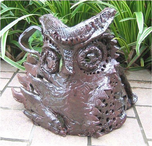 焼き物「フクロウ」…庭先でがんばってます。制作 2006.6月