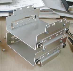 選んだのがこれで、 ジャパンバリュー社製の PH-35HTS という型番。 アルミ製でFDDトレイに ぶら下げる構造。 今回は、とりあえず 2段重ねで止めておく。 ...って、RAIDでも組まない 限りはそうは必要ない。 |