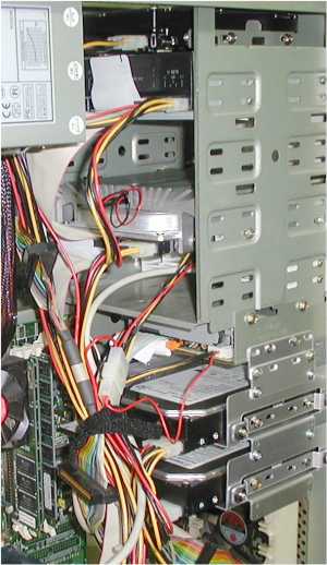 フルタワーらしく (^^ゞ HDDが4台ほど納まった。 上から ・SCSI HDD (天板下の隠しベイ) 5inch ・DVD-ROM(2nd master) ・1つ空き ・IDE HDD(2nd slave) (HERMANNATOの中) ・(空きのように見えて) USB HUB 3.5inch ・FDD 今回の増設3.5inchベイ ・WinXP Drive(Primary master) ・Win2K Drive(Primary slave) 5inchベイに1つ空きが できたのが収穫。 |