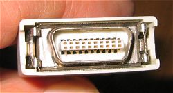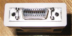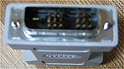 Cこの変換アダプタのDFP20pinメスコネクタ。 見事にモニタ直づけケーブルに付いているオスコネクタAと適合する。 普通Aを見てオスとは思わないのが、15pinのアナログディスプレイしか使っていない私なんぞの悲しいサガ。下のDのようにとがったピンが出ているのがオスだと認識してしまっている。 (ちなみにCとDではずいぶん色が違った写真になってますが、正真正銘Bの両側の写真なのです。) |