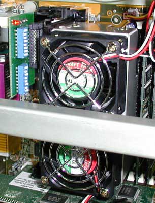夏も近づく..夜、冷却を強化する。(2000.6.14) ALPHA(P7125M60)をゲットする。 でかいヒートシンクをアルミ板?でくるんであり、 M/Bの電源ソケットなどにあたりそうなところに はじめから切りかき部分がある。 特長はファンがヒートシンクの横に付いている。 M/Bの方に吹き付けられるのかと思ったら、 逆にCPUとM/Bの熱をこちら側に逃がす設計。 前のALPHA(P612H35TM)と比べると ファンの風きり音がぐんと静かになっている。 | ![]() |