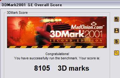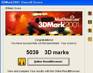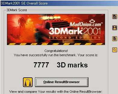 比較の対象とは、M/Bだけでなく、メモリと、 ちょっと前にビデオも換えているので、 スコアの違いが何によるものかが判然としないのはご勘弁。 ま、だいたいのところを(自分なりに) 感じでとらえておくための比較データなので。 CPUが同じだけど、Superπで若干速くなっている。 > CHIPSET & DDR ビデオはHDBENCHでテキストが異常に速い。ホントか? 3DMark2001 はSE のVersionが上がったお陰で 完動するようになったのが有り難い。 Radeon8500LE のお陰で、 すべてのシーンが見られる。魚が泳ぐシーンもバッチリ。 HDD のスコアのUPは、 BarracudaIV にFormatかけたばかりなので、 これぐらいは出る。 また環境がゴチャゴチャしてくれば、 パフォーマンスが悪くなるのは仕方ないのでしょう。 右のスコアは裏番組のWin2K環境で走らせた3DMark 。 7777 と、なかなか縁起のいい数字なのでおまけ。(^^ゞ | ![]() |