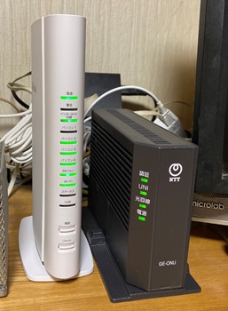 およそ5年ほど前にNTTからauに光回線を変えてそのままだったのだけど、今回スマホの機種変に合わせて、au でやってた光回線と、NTT の電話回線もまとめてSoftBank 光 で統一することにした。< その方がお得、と何度も言われてたのでしたが、つい面倒で...。 実際やってみて、ホントに面倒。(T_T) > 10/30が工事日。担当の方、電柱登って回線切り替えたり、ワタシの汚いPC裏側やホコリと混沌のデスク下コンセント周辺探索など、結構ハードな作業をニコニコしながらやってくれて、本当にご苦労をおかけしました。 並べてみると、光を直接受けるONU は NTT謹製なんですね。 左のルーターがSoftBank ロゴ入りで、前面のLED がすごく賑やか。 USBポートが2つ付いているのは便利に使えそうだけど、どうせなら前面にあると使いやすいのに...と思ってしまう。 |