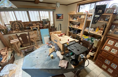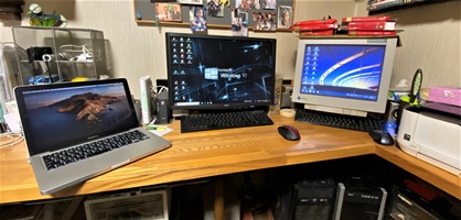 iPhone 11 の超?広角撮影でPC周りショット。新しいルーターのLANポートは4つともそのまま埋まってしまった。行き先不明でよく覚えていないのがHUBから先にも2~3本。(^_^;) この際なので、デスク周辺と下奥の足回りに溜まったホコリを大掃除。 |