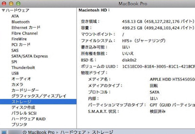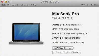 このノートの基本情報。CPU はデュアルコアで 2.5GHz ありゃ必要十分で、購入する際にメモリを 2GB ×2だったものを 4GB×2 に増設したもの。 8GBあればストレスなくいろいろやれるでしょう...と思って。 OSのOS X 10.9.4 は、10.9.2 だったものを、セットアップ直後にとりあえず最新のものにアップデートしたあとの状態。 最新のハードウェアにせずに、2年前のモデルで何とか性能アップを...と考えるのがどうやら自分。..(T_T) 解像度がレティナモデルでないのだけが残念といえばまさに残念。 |