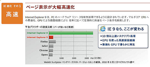 広告によると今回のI E 9 Betaは、Web標準への準拠 IE9では、HTML5, CSS3, DOM, SVGといったWeb標準をサポートし、従来のブラウザで多発したブラウザ間の表示の相違を回避する。 これについては、Acid3テストのスコアを目安に標準の適合度を上げていく予定だという。 高速なJavaScriptエンジン 「Chakra」というJavaScriptエンジンを開発。マルチコアCPUを活用しバックグラウンドでコンパイルすることで、IE8よりはるかに高速な処理が可能となっている。 ハードウェアアクセラレーション レンダリングエンジンを刷新。GPUの性能を活用することで、HTML5で動作する高度なWebアプリケーションや動画を快適に表示することが出来る。 ...なんですと。売りのいくつかの中でも、とくに「ページ表示が大幅高速化」というのは気になります。しかし、上の図からですと、I E 8 からはずいぶん速くなってるようですが、やっと他のと同程度になったというグラフにしか見えないんですけど。 |