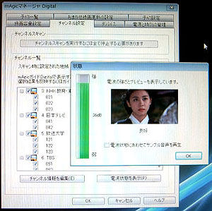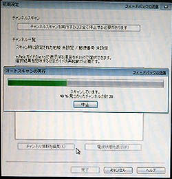 ![]() TVチューナーカードを挿したらまずやらされるのが、チャンネルスキャン。 チャンネル番号はあとで(好きな番号に)編集する必要がありますが、TOKYO MX とかチバテレビ、テレ玉、放送大学などもきれいに電波を拾ってくれて、合計11チャンネルのTV視聴が可能になってます。 もぅひとつ気張ってBSの電波も拾えるカードにしとくんだったと、ちょっと後悔。 |