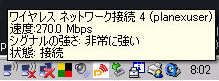 接続状態...ネットワークカードのユーティリティ(左図)で見てみると、接続の品質、シグナルの強さとも100%の状態になってます。