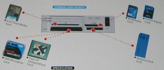 USB 転送のデバイスであることは変わらないが、M/B上の拡張USBピンから接続する。コネクタの挿し方など、Maid In Englandの簡単デバイスらしく何も書いてないのでちょい苦労。 最初はやはり逆差しして全く認識されなかった。 今あるメディアを3つほど同時に挿してみる。 スマートメディアとコンパクトフラッシュ、そして新?ノートで使ってるSDカード。 インストールした段階でリブーバブルディスク・アイコンが4つほど(4ポート分?)認識される。 リムーバブルディスクが4つも並ぶとどれがどれだか分からなくなるけど、 最初にメディアを認識した状態で、右下のようにアイコンで表示されるので分かりやすい。