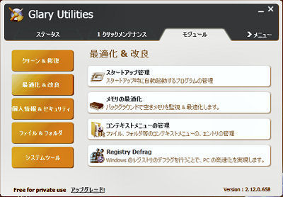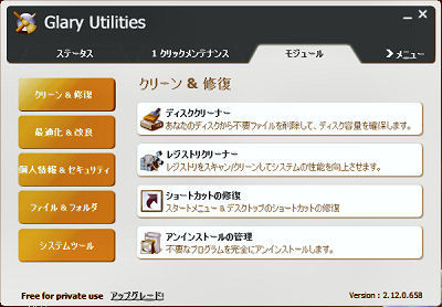 下がAの GrayUtilities 。 レジストリのクリーンアップや最適化などに役立つソフトです。 前にも紹介したCCleanerとほぼ同じような機能で、それよりは強力にシステムファイル関係をチューンアップできるようです。 わたしはどちらも併用してます。GrayUtilitiesは右のURLから落とせます。 http://www.glaryutilities.com/ |