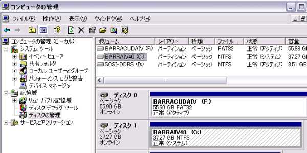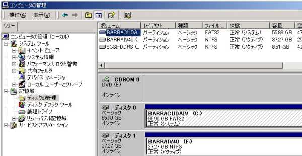 Win2K環境では、どうかな...と思ってやってなかったブートDriveのNTFS化、 WinXPでは「 convert c: /fs:ntfs 」でやってしまった。 (2001.11.11) 上がWinXPから見たDisk管理で、下がWin2Kから見たもの。 こうしてみると。2000からXPでの(Disk管理上などの)大きな変化がないことが分かる。 ![]() ![]() XP をNTFS にしてしまったら、Win2K からは見えなくなってしまうな...と思っていたのだが、問題なく見える。 Win2K の入ったブートDiskもNTFSにするっきゃないと思ったのだが、見えてるのでFAT32 のままにしておく。 NTFS でFormat したDrive がローカル上では見えなくなってしまうのって、FAT からなんだっけか...(忘れた)。 (Network からはFAT だろうがFAT32 だろうがNTFS だろうが関係なく見えるので問題ない。) よくよく考えてみれば、データDrive で使っているSCSI (DDRS) はとっくにNTFS にしてあったのに見えてた。(^^;; Drive やフォルダの圧縮をする必要も感じてないし、クォークでDisk 割り当てをする必要もないのだけど、 ファイルやフォルダ単位でセキュリティを高められることが、NTFS にした大きな理由。 データDrive は作ってあるけどBackup が主な用途で、通常データフォルダも含めて1Drive ですべてやってしまっている。 しょっちゅうアクセスするPrivate なデータフォルダなどを、Network 上から隠しておくことも必要になって来ると思うので。 |